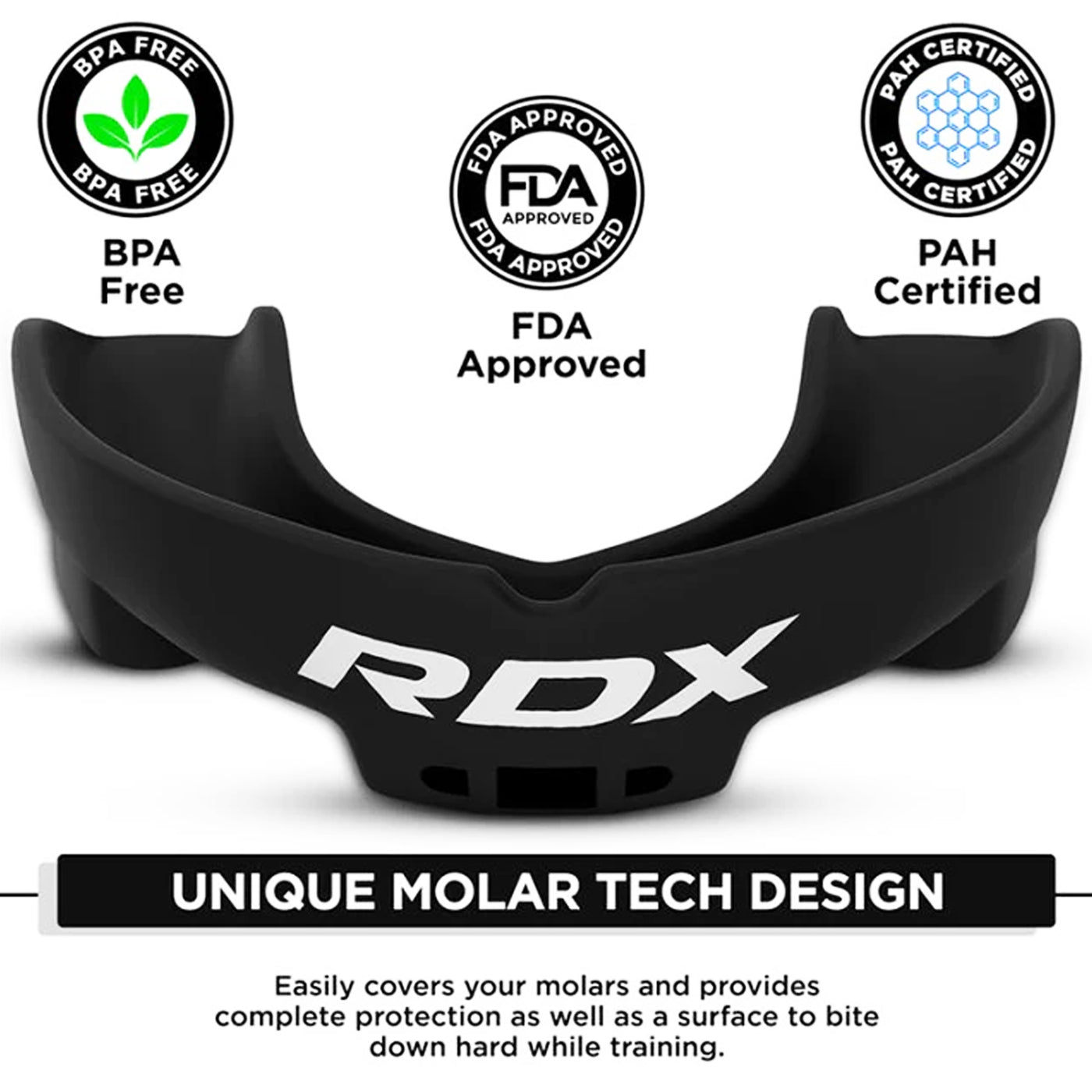 The RDX 3w Mouth Guard for adults in black offers superior protection for your teeth and gums during intense sports activities. Designed with a triple-layer system, it provides enhanced shock absorption, durability, and a comfortable fit. Its durable material ensures long-lasting use, while the contoured shape promotes easy breathing and clear communication. Ideal for boxing, MMA, rugby, and other contact sports, this mouth guard helps reduce injury risk without compromising performance.